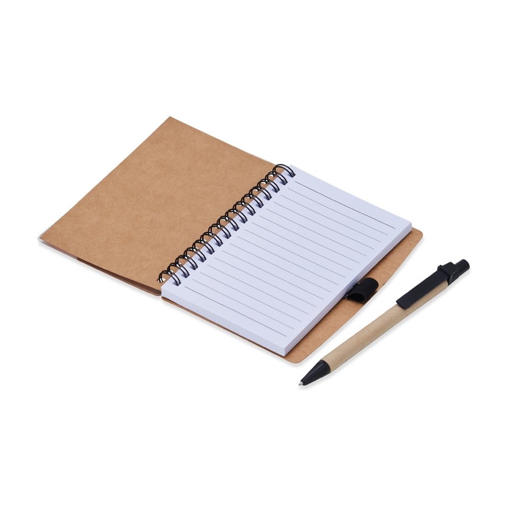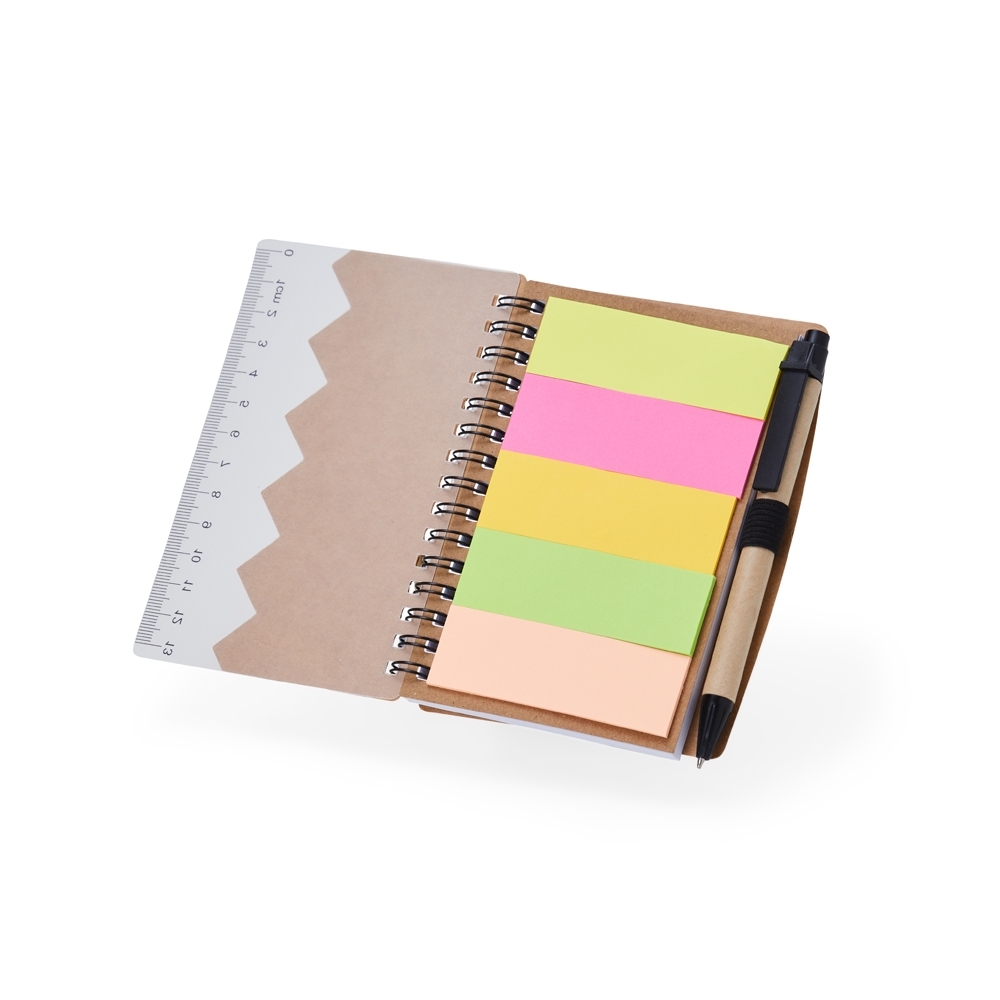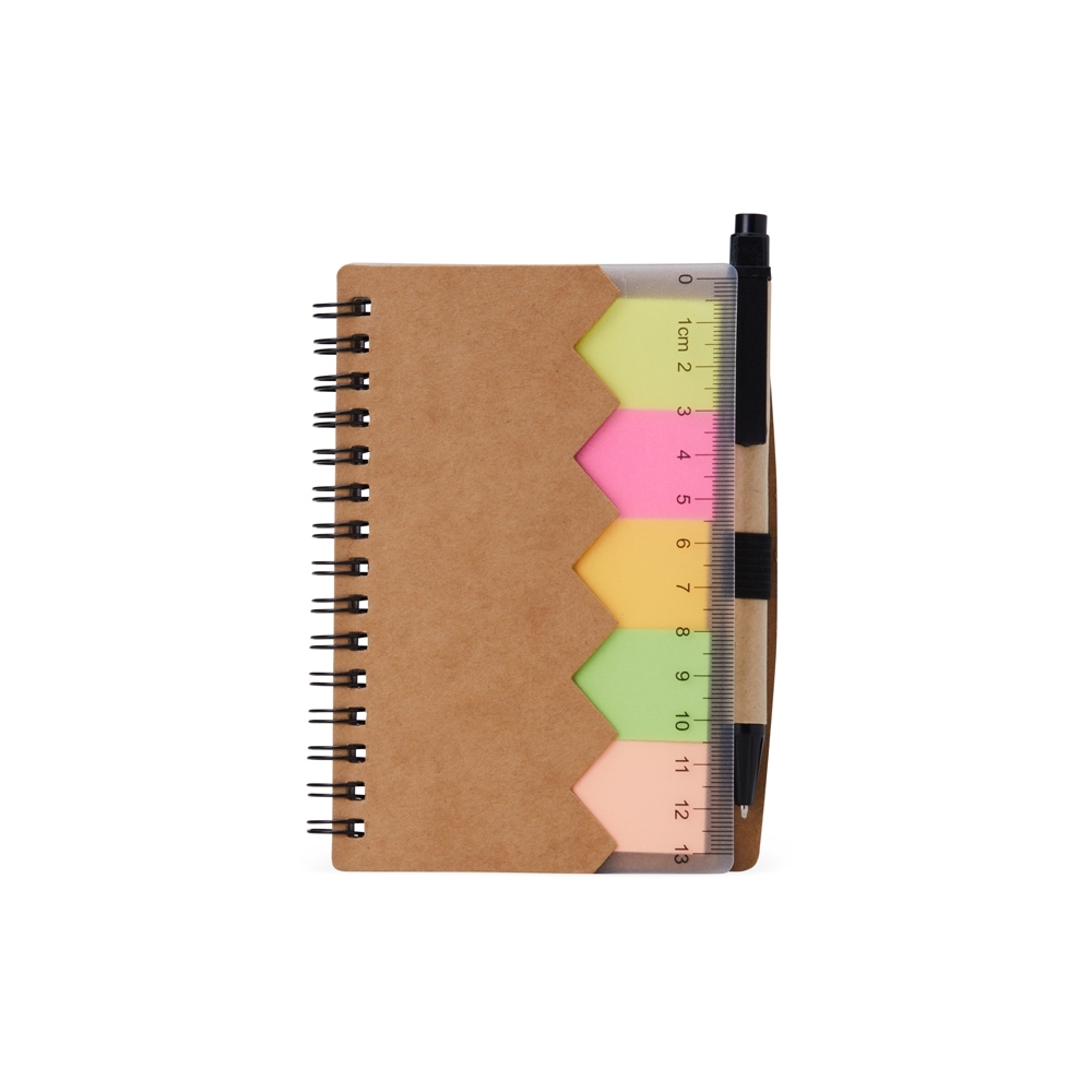 Bloco de anotações ecológico com autoadesivos, régua e caneta, feito em kraft. Contém folha com de régua 13 cm, cinco autoadesivos com aproximadamente 13 folhas, bloco com aproximadamente 69 folhas brancas com pauta, porta caneta elástico e acompanha caneta de papelão com detalhes plásticos, carga esferográfica azul 1.0mm e acionamento por clique.