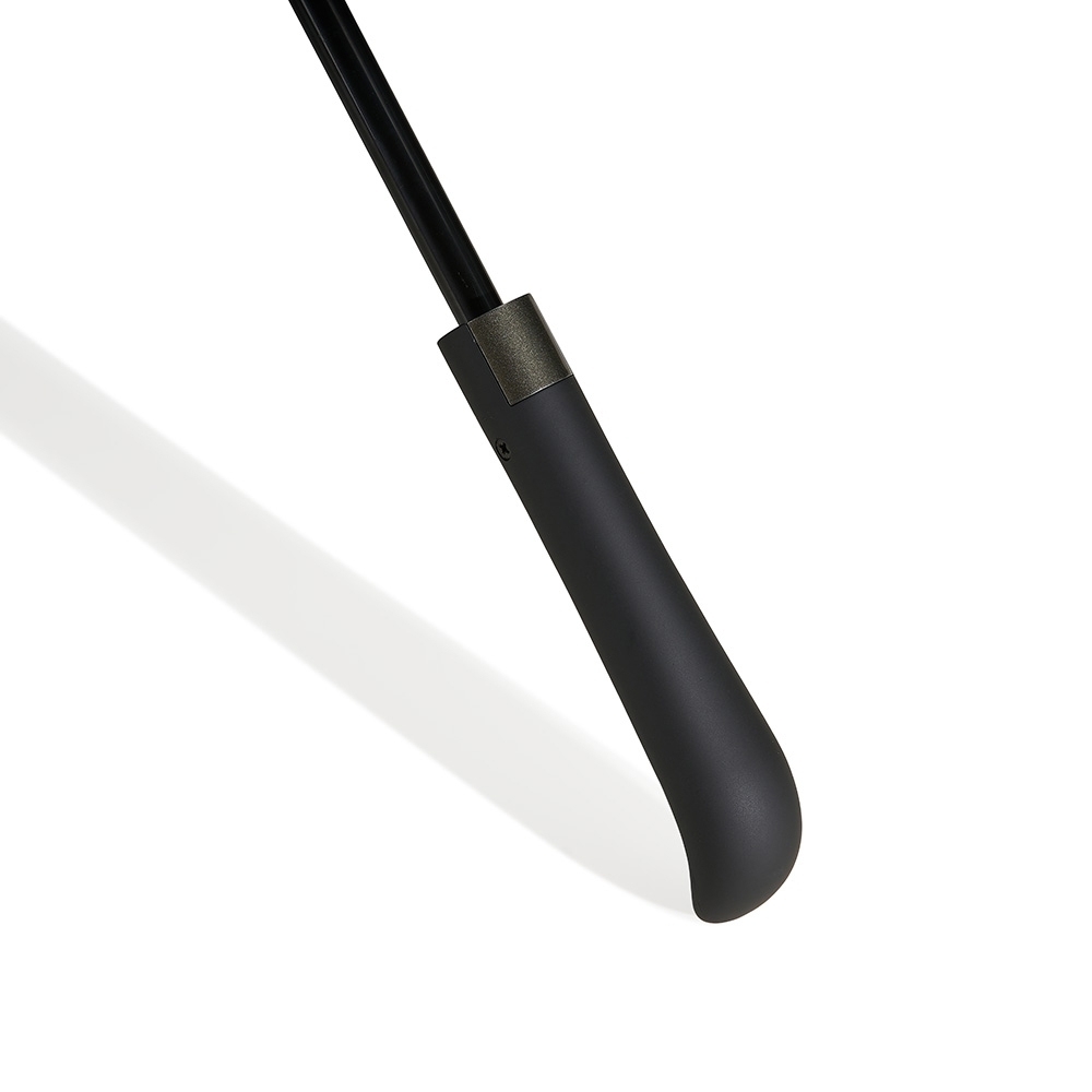 Guarda-chuva de nylon com extensão de tecido para ampliação da área de proteção. Com botão para acionamento, o guarda-chuva contém cabo emborrachado, estrutura metálica, 8 hastes de fibra e fita com velcro para lacre.