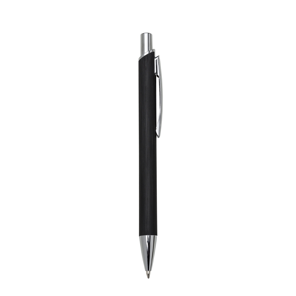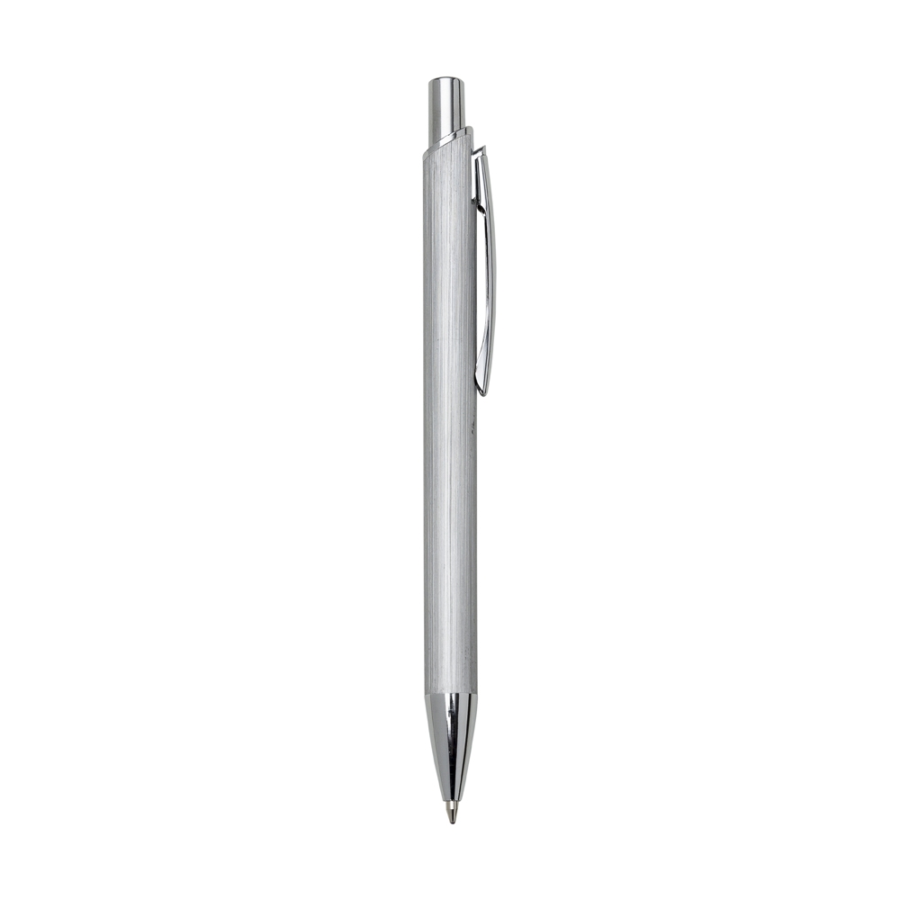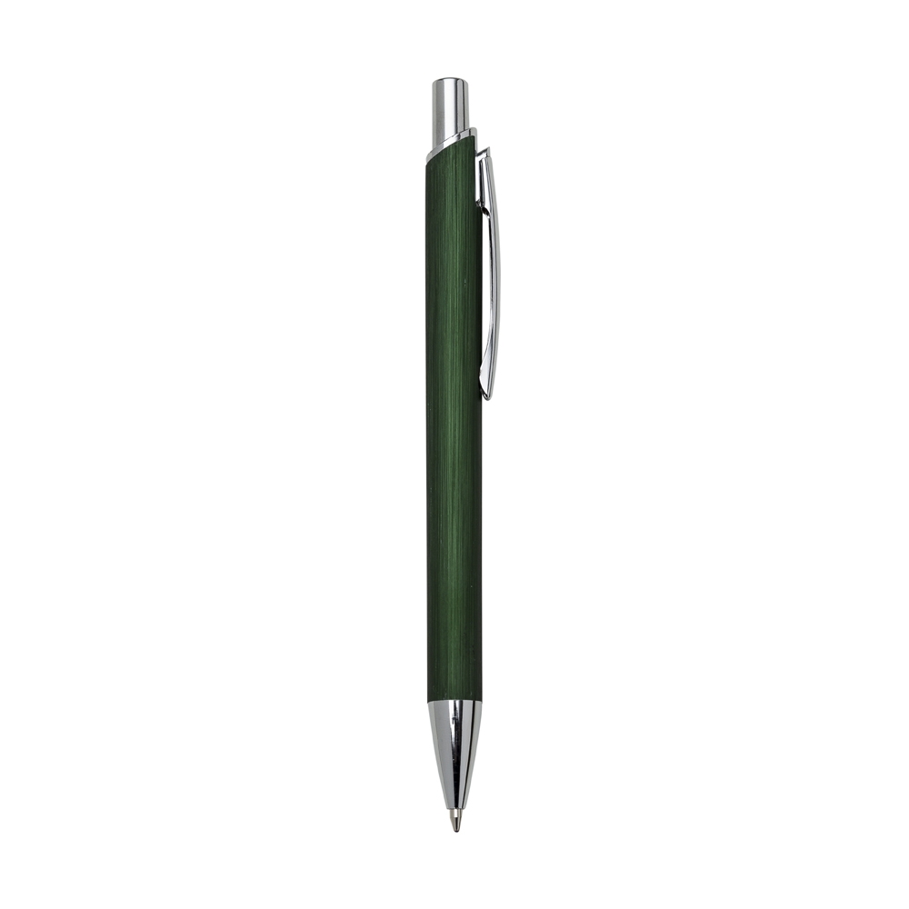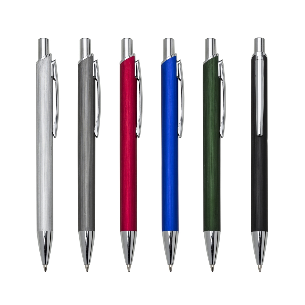 Caneta alumínio inteira colorida com detalhes prata, pintura tipo escovada. Clip metal, acionador e ponteira prata. Aciona por clique.
