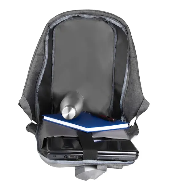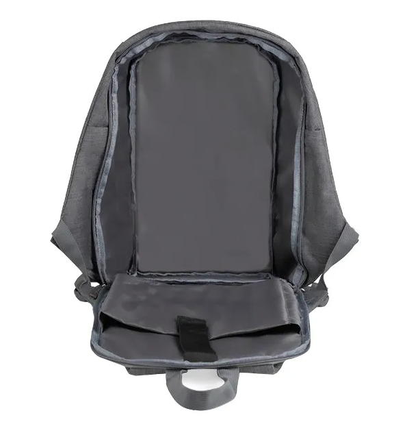 Mochila antifurto cinza em Poliéster 300D Melange Cinza. Conta com alças para as costas; alça para as mãos; alça para colocar na alça da mala; compartimento interno para notebook de até 15″; faixas refletivas na parte frontal.