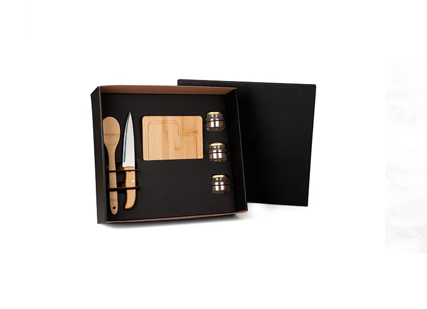 Kit para Cozinha e Tempero; Conjunto composto por uma tábua e colher 30cm em Bambu; Uma faca 7” em Aço Inox/Bambu; 3 potinhos de vidro com tampa.