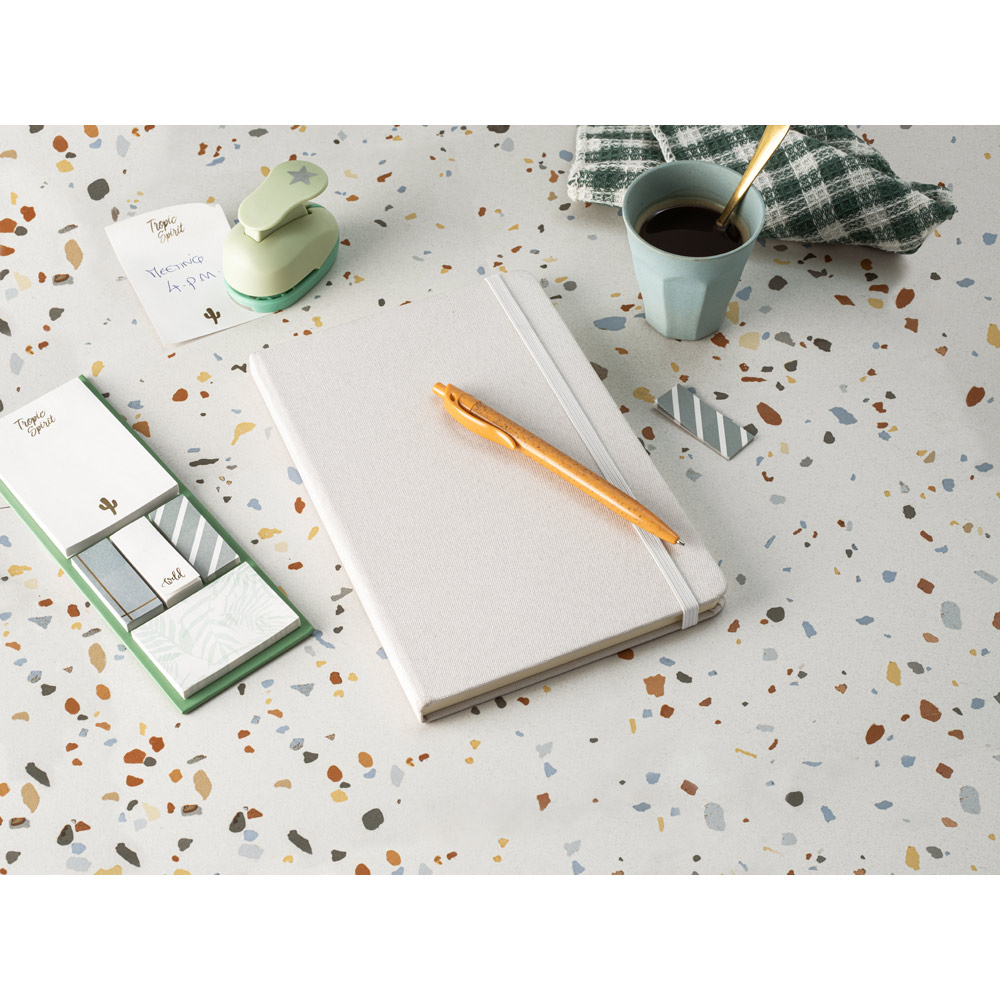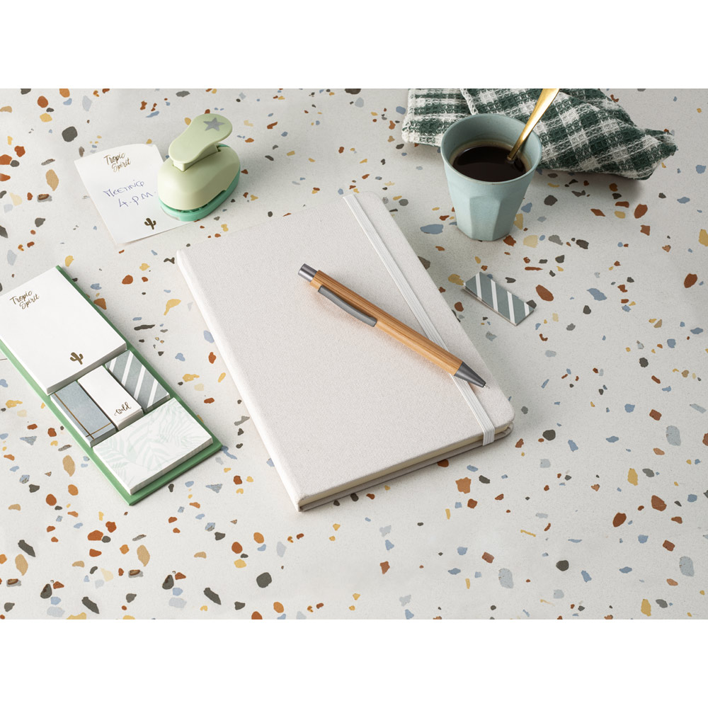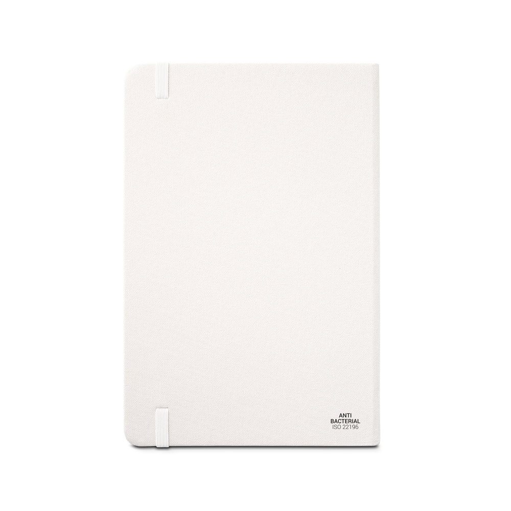 Caderno A5 em PET reciclado com tratamento antibacteriano, segundo a certificação ISO 20743. Contém 80 folhas pautadas cor marfim, em papel proveniente de gestão florestal sustentável, elástico e fita separadora. 140 x 210 mm