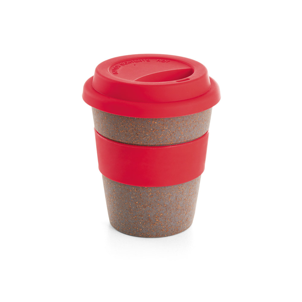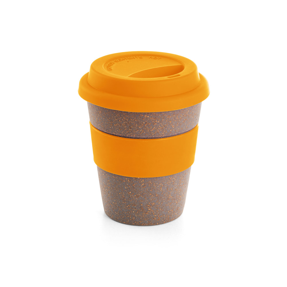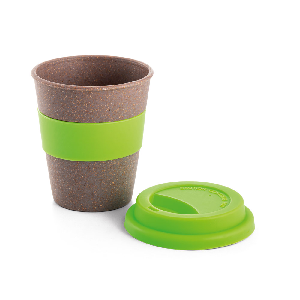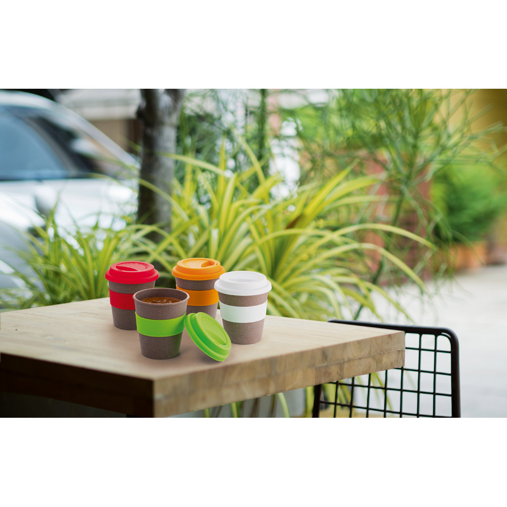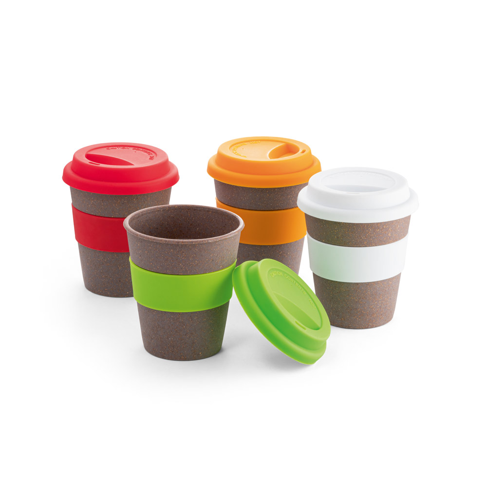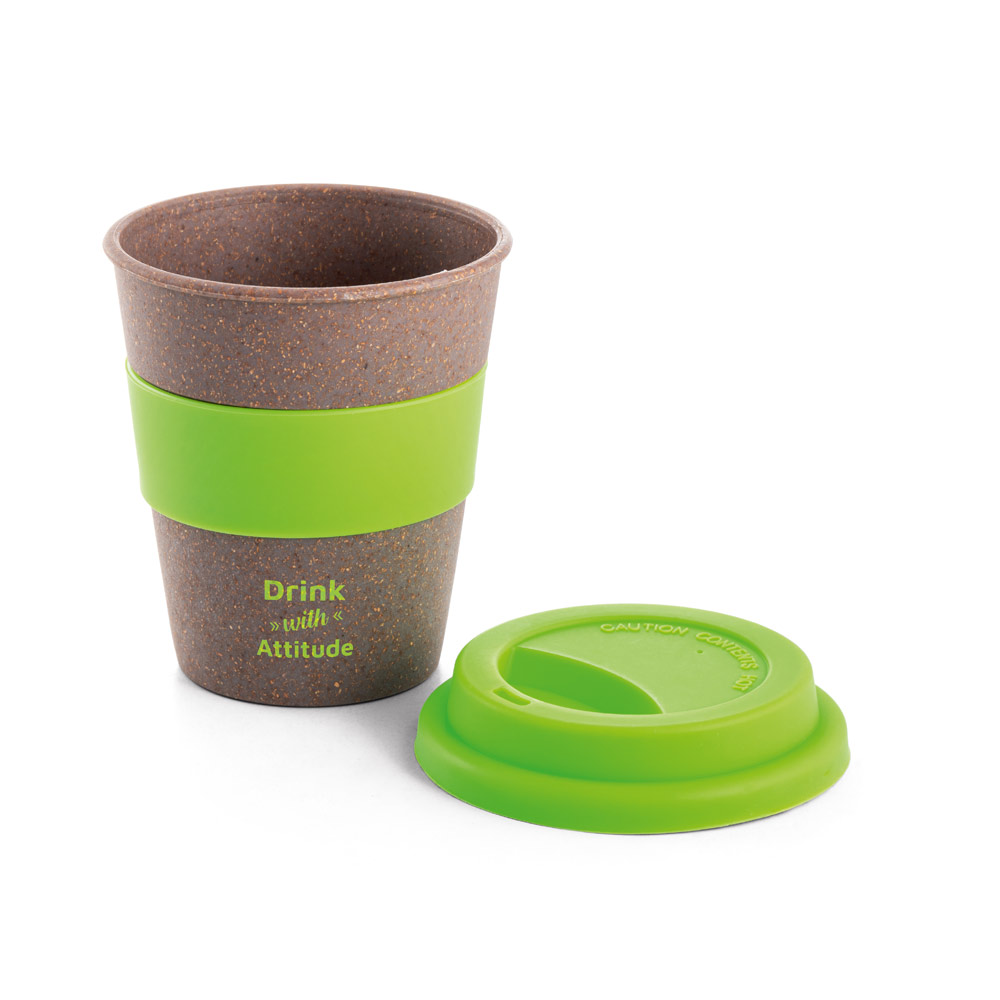Copo de viagem em fibra de bambu e PP com tampa e tira em silicone. Capacidade até 390 ml. Food grade. Retirar tampa antes de colocar no micro-ondas. Ø95 x 113 mm