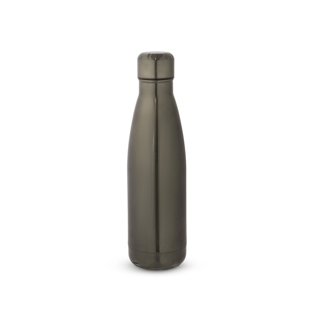 Garrafa em aço inox de parede dupla térmica, isolada a vácuo. Garrafa com acabamento metalizado e tampa em aço inox. Todas as componentes da garrafa – tampa, corpo e base – na mesma cor. Capacidade até 510 mL. Fornecido em caixa presente de papel kraft. Certificação EU Food Grade. ø70 x 255 mm