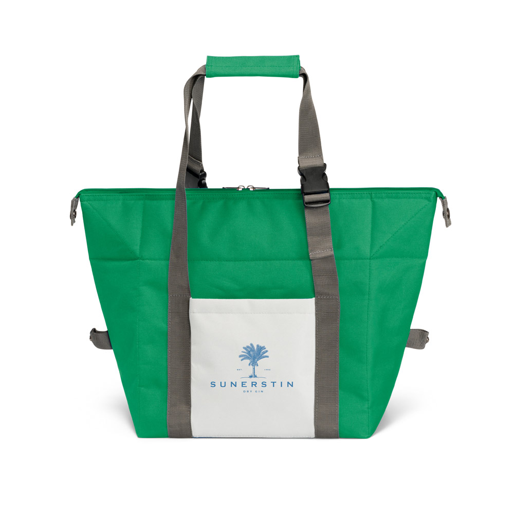 Sacola térmica em 600D com 2 formas distintas de utilização. Compartimento principal com zíper duplo e interior forrado em PEVA e almofadado. Contém bolso frontal com zíper e alças ajustáveis em webbing com reforço. A sacola tem capacidade até 15 L. 480 x 330 x 180 mm | 310 x 240 x 180 mm