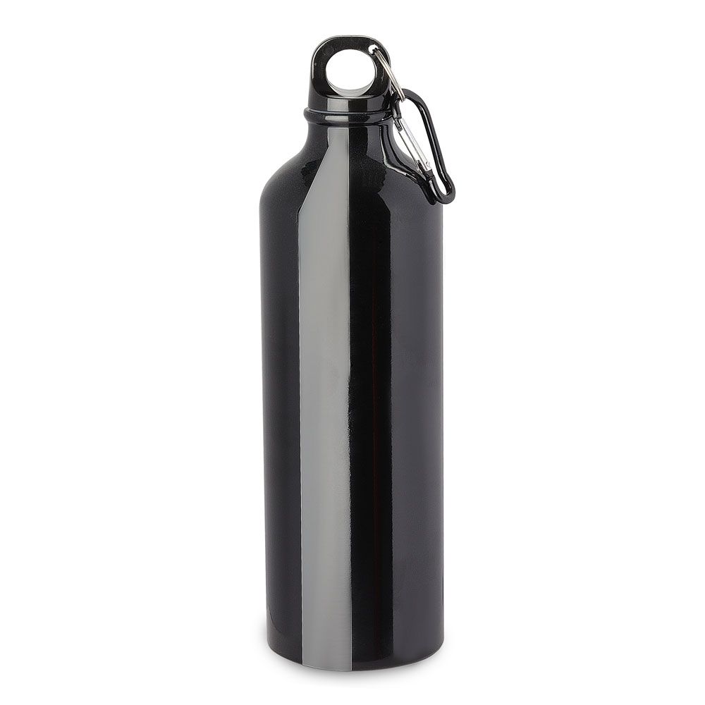 Garrafa em alumínio, tampa de plástico com mosquetão colorido. Capacidade de 750ml, com pintura metálica.